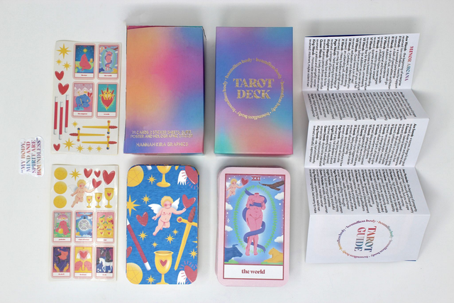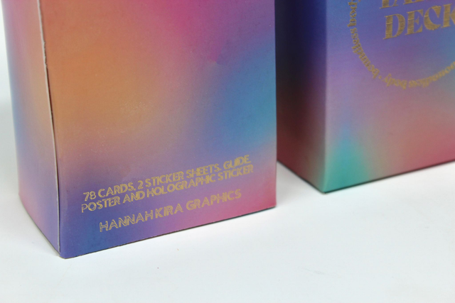 78 cards, tarot guide, poster, 2 sticker sheets (to decorate your box) and a limited edition holographic sticker.