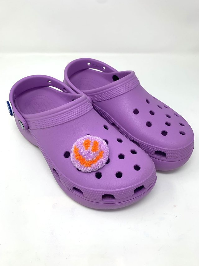 Hand tufted croc charm, with a transparent backing that is easily attachable to crocs.